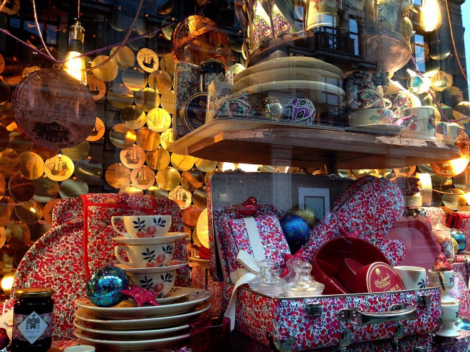 クリスマスを飾る華やかなレッドのカーテンや雑貨でディスプレイ