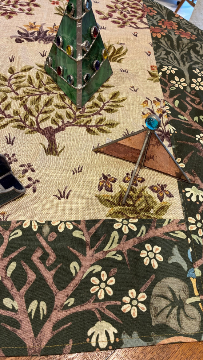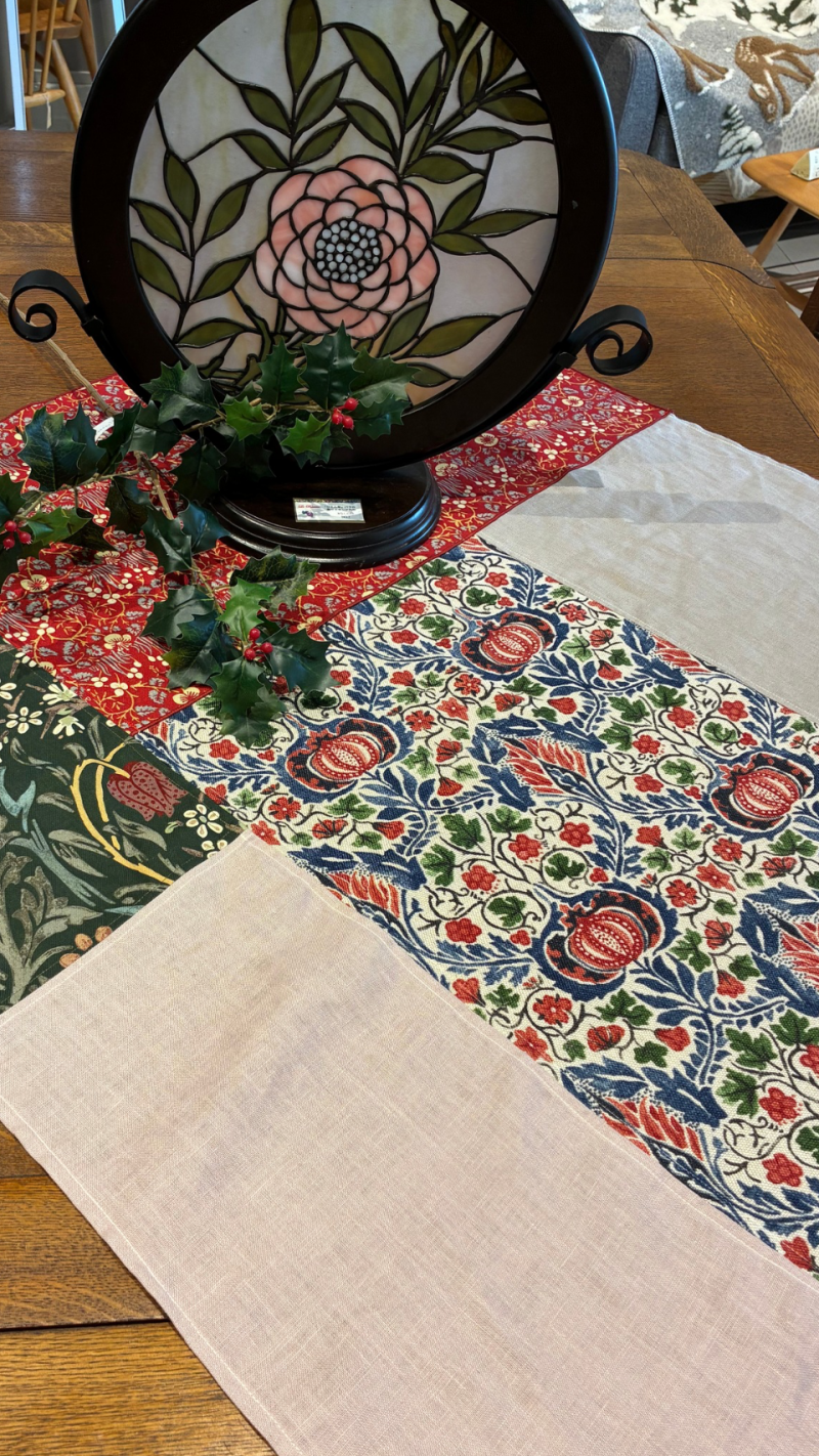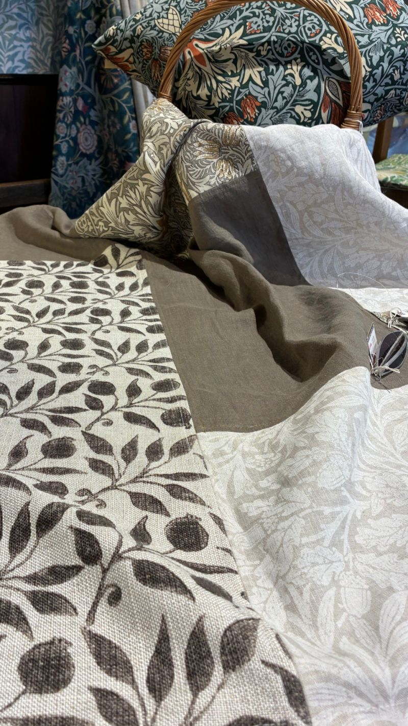 イギリスでプリントしたウィリアムモリスの生地と リトアニアやフランスのリネンをレイアウトしたカーテン。 モリスの魅力がじわじわ来る