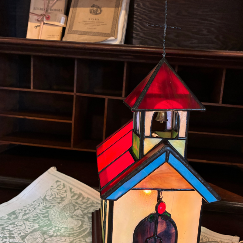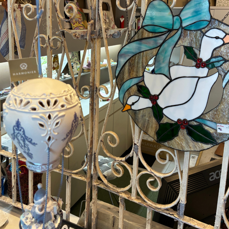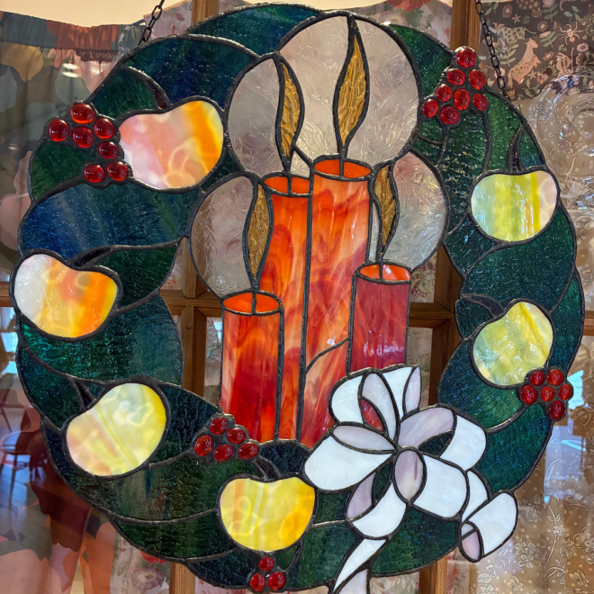 モリスのステンドグラスに 加えてクリスマスのステンドグラスも 12月の冬の陽射しに輝いています。
