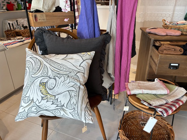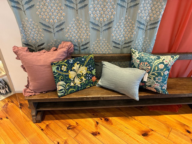 イギリスの生地や、くったりリネン。 ベンチに、1人がけ椅子に、ソファにも。 春のクッション、増やしました。