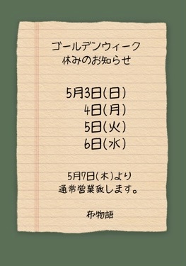 5月3日から6日まで GW休みを頂きます。 ご迷惑をお掛けしますがよろしくお願い致します、 5月7日より通常営業致します。
